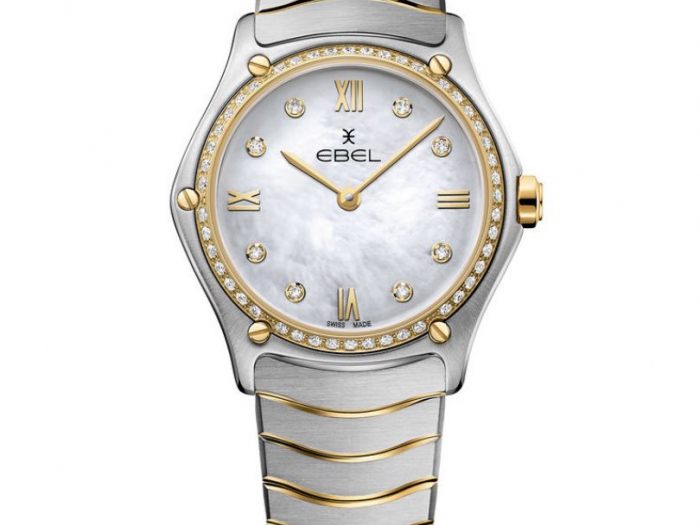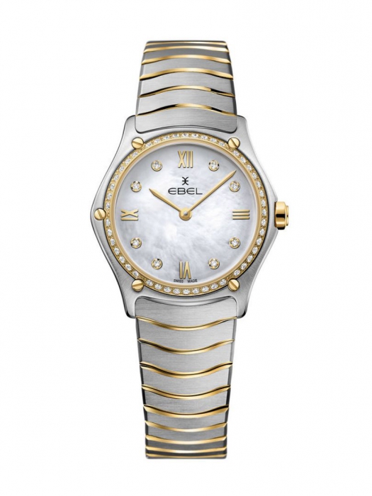 Dames EBEL Sport Classic Lady 1216390A , roestvrij staal en 18 karaat geel gouden kast, Ø 29,0 mm, parelmoeren, wijzerplaat met toegepaste romeinse cijfers en 8 diamanten, de lunette is ook voorzien van diamanten, saffierglas met antireflecterende behandeling eronder, tweekleurige roestvrijstalen golfschakelband.