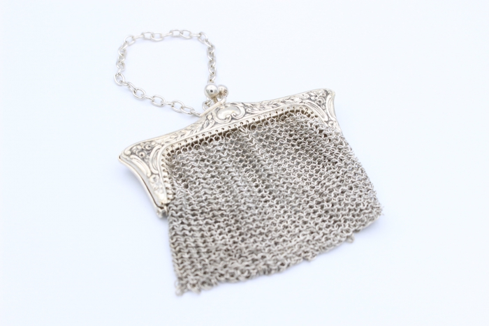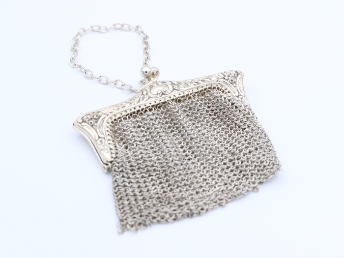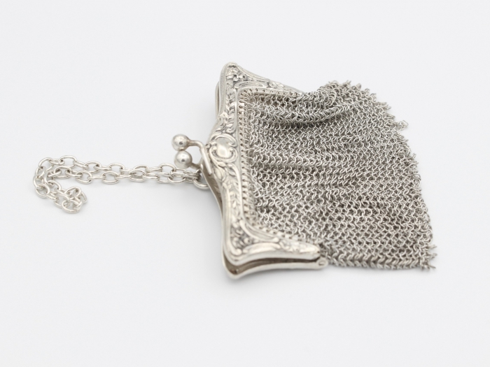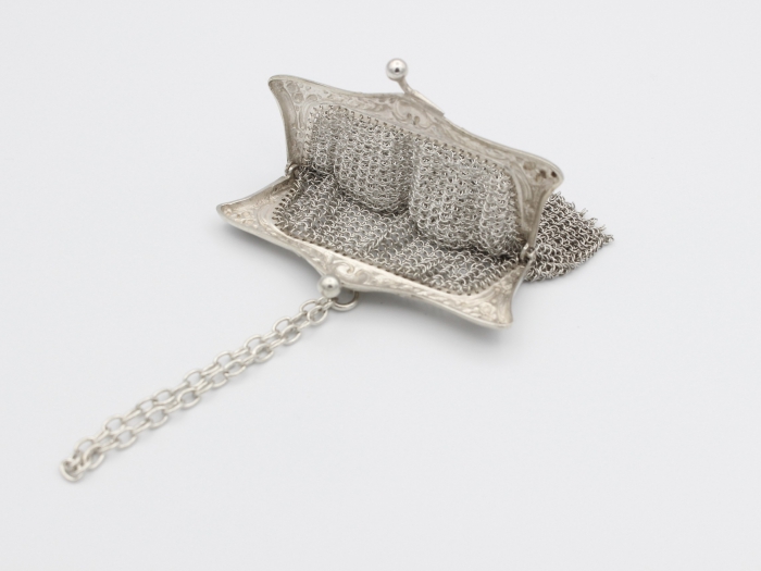 2e gehalte (835/000) zilveren maliƫnkolder, beursje met klipsluiting. + 1920. Afmetingen: 69.5 x 69.5 mm Gewicht: 35 gram.