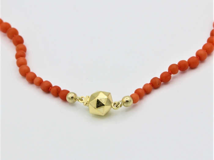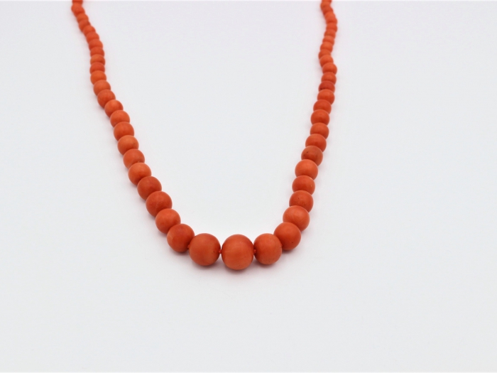 Bloedkoraal collier aflopend 4mm tot en met 12mm. Collier is voorzien van een 14 karaat geelgouden sluiting met twee gouden inlakbollen. Lengte collier: 60 cm.