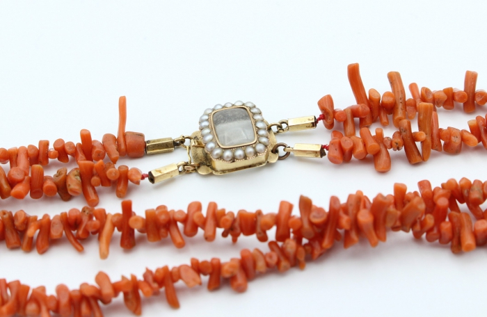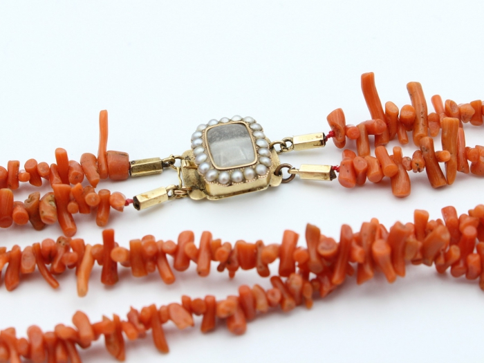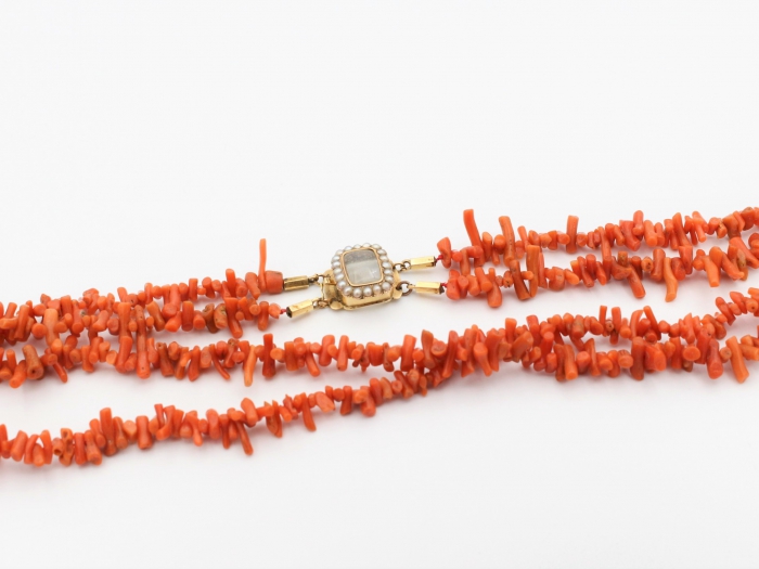 Antieke dubbelrij bloedkoraal takjes collier. Het collier is voorzien van een 14 karaat geelgouden bakslot gezet met blisterparels. Lengte collier: 62cm.