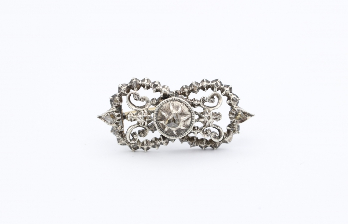 Antieke zilver met gouden broche. Gezet met roosdiamant. Nederlands gekeurd rond 1900.