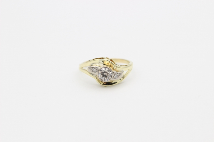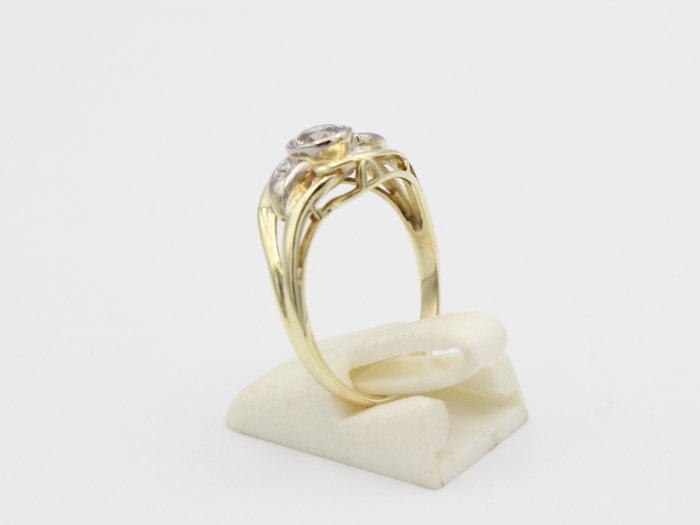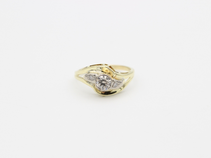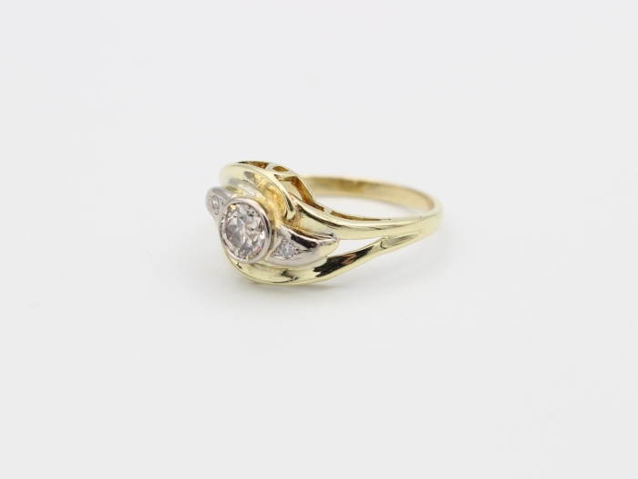 14 karaat geel-witgouden dames ring bezet met 1 center oud-europees geslepen diamant en twee 8-kant geslepen diamanten, pavé gestoken in het aplique gedeelte. Gewicht: 0.50crt. Kleur: J. Zuiverheid: Pique Gewicht: 3.8 gram. Ringmaat: 18.5