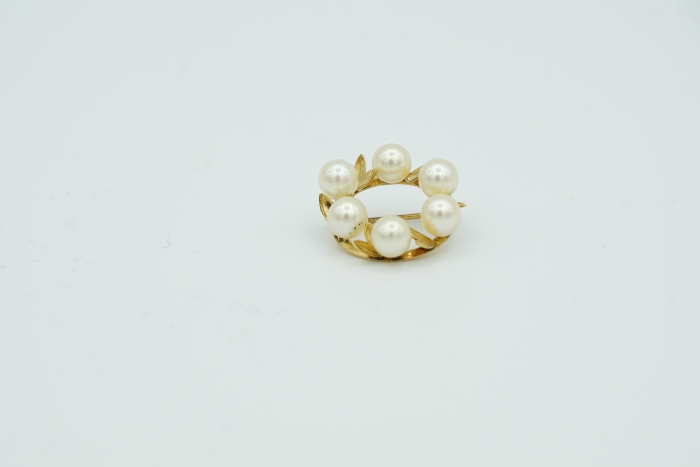 14 karaat geelgouden broche, een cirkel met om en om een pareltje en gouden blaadjes. Totaal 6 pareltjes; doorsnede 5 ½ mm. Doorsnede broche: 22 mm. Gewicht: 3.61 gram.