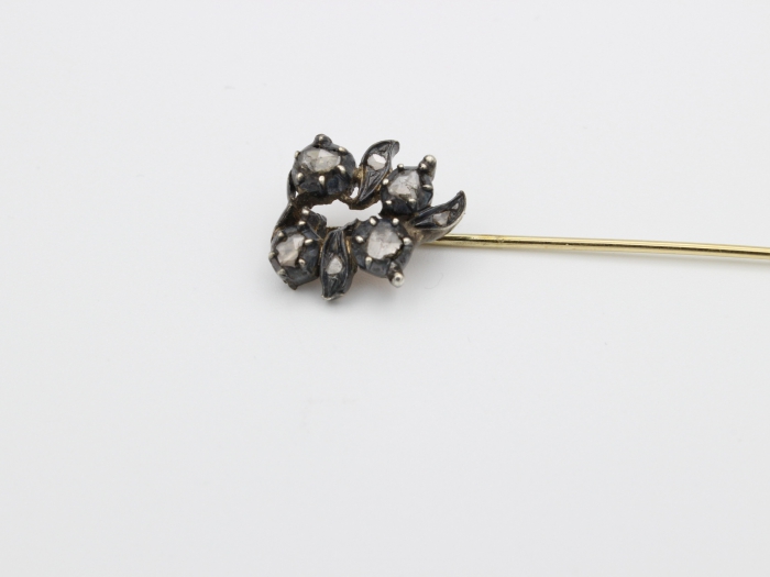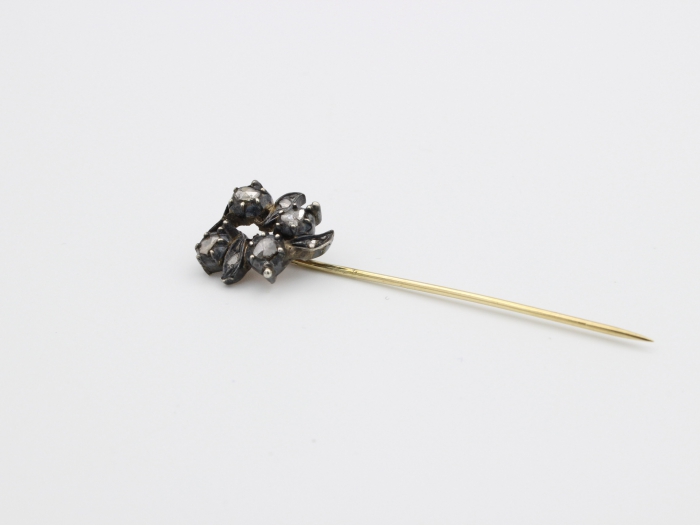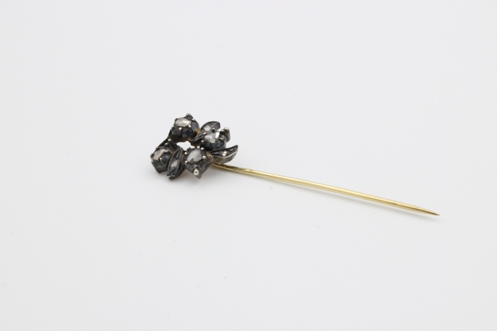Zilver/ gouden dasspeld, waarvan de kop is bezet met 7 roosdiamanten. De 14 karaat geelgouden speld heeft een nederlands keurmerk van voor 1953. Gewicht: 2.16 gram.