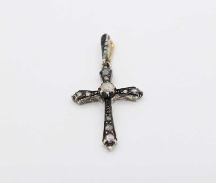 14 karaat antiek gouden kruis bezet met 10 roosgeslepen diamanten.