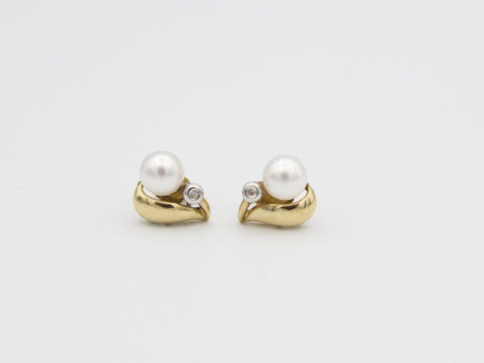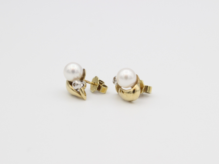 14 karaat wit-geelgouden oorstekers met Zoutwaterparel, diameter 7mm. en in witgouden bus gezet een 8 kant geslepen diamant. Afmetingen: 12 x 11 mm. Gewicht: 3.9 gram.