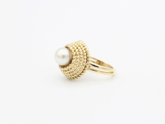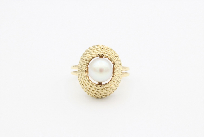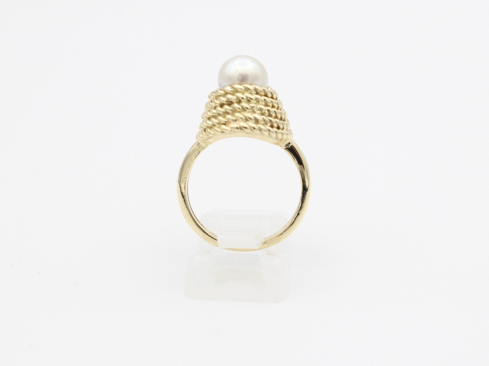Bijzondere 14 karaat geelgouden dames ring met zoetwater parel. Diameter parel: 7.5mm - 8mm. Afmeting kop ring: 18 x 15 mm. Ring maat: 17.25 Gewicht: 7.7 gram.
