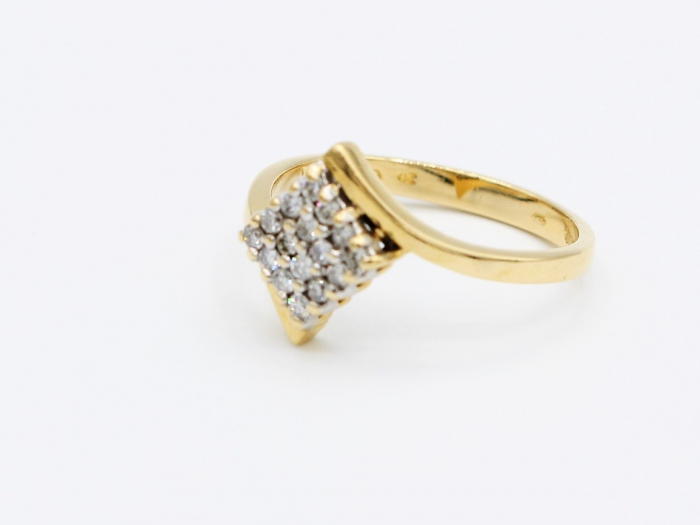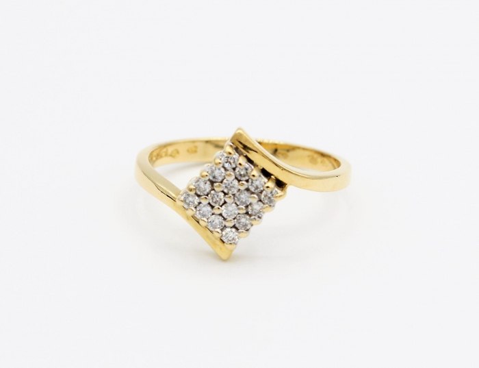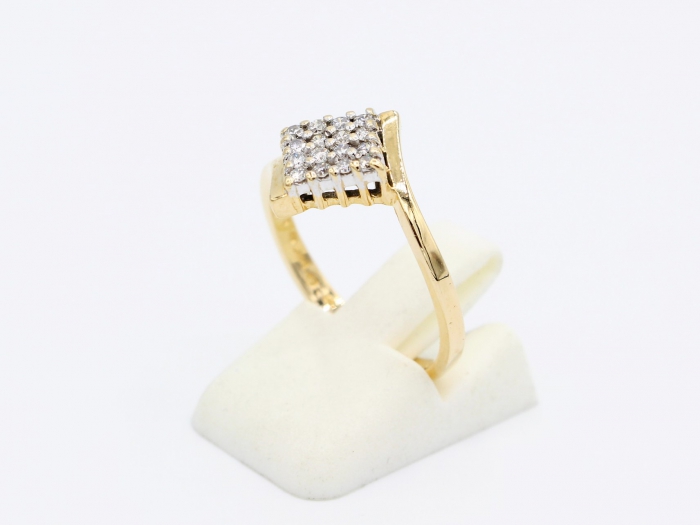 14 karaat geelgouden damesring bezet 16x briljant geslepen diamanten gezet in witgouden chatons. Totaal: 0.20 ct. Kleur: H. Zuiverheid:: SI. Maat: 17. Gewicht: 2.6 gram.