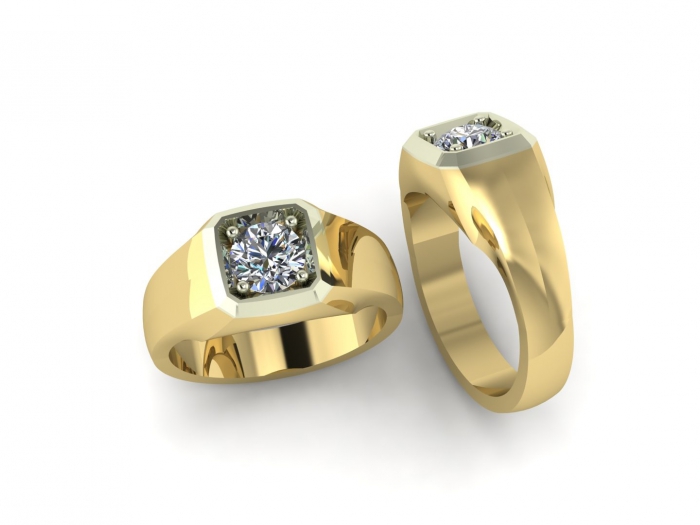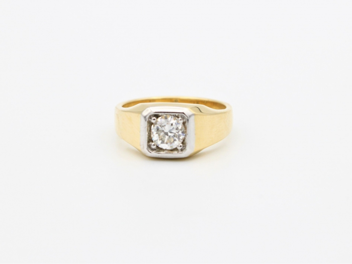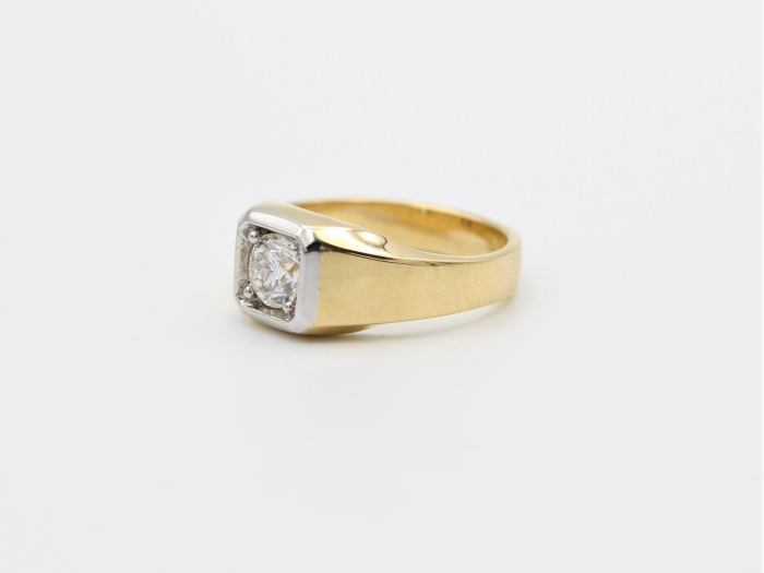 14 karaats geel, witgouden massieve heren ring. Bezet met 1 briljant geslepen diamant 0.70crt. Kleur: H. Kwaliteit: VS2. Inclusief GIA certificaat. Deze ring is in verschillende kleur en maten te bestellen. Levertijd: +/- 3 weken.