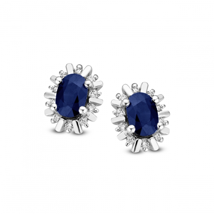 14 karaats geel, witgouden oorsieraden Lady Kate model. Voorzien van briljant geslepen diamanten totaal 0.15crt. Kleur: H. Zuiverheid: SI. En in het midden een blauwe saffier gezet.