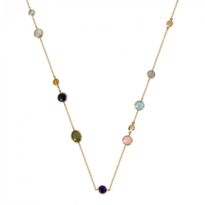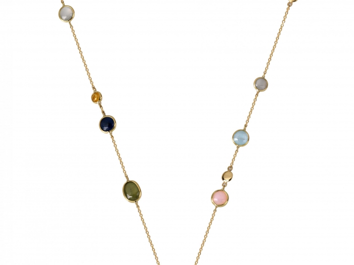 Het collier is bezet met verschillende kleurstenen; blauwe topaas, korund en maansteen