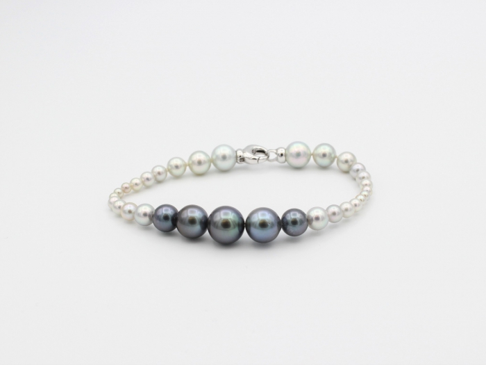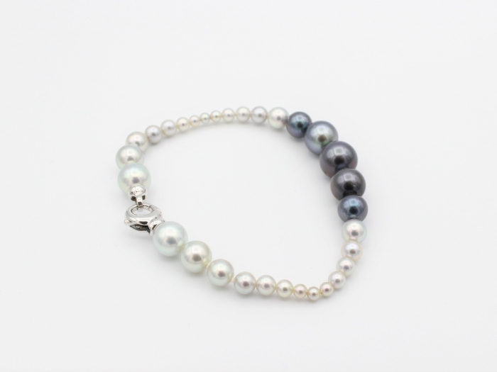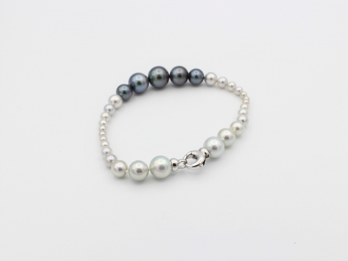 Armband voorzien van Akoya en Tahiti parels. Oplopend van diameter 3mm tot 10mm. Lengte: 19cm.