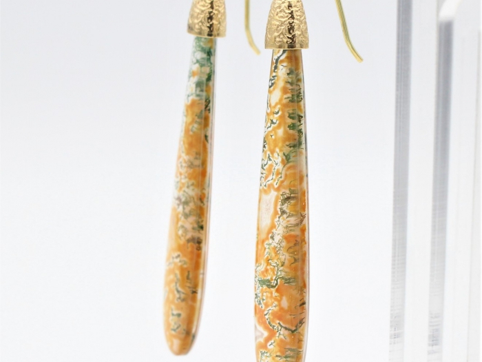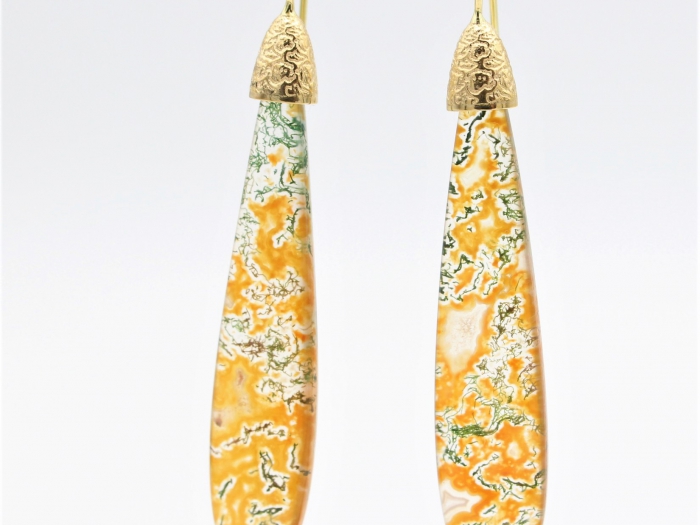 Mosagaat briolette oorhangers met 14 karaats geelgouden haken. Afmeting: 59x12x5mm,