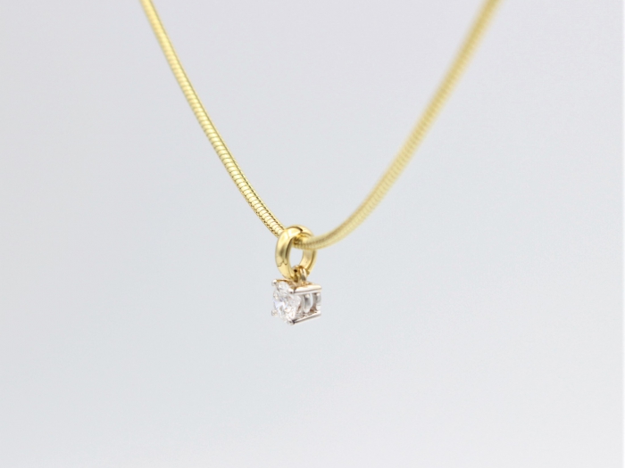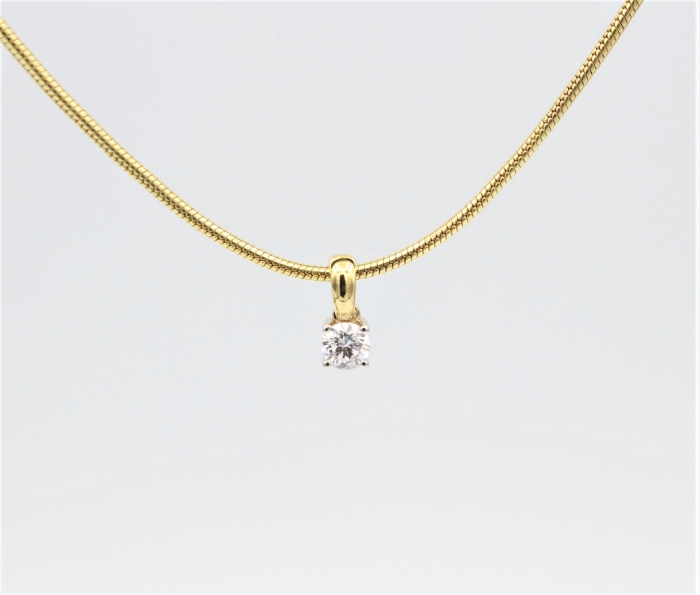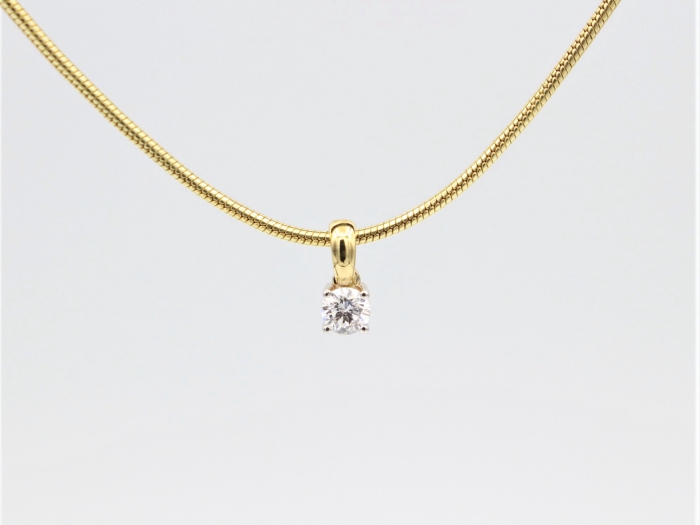 18 karaats geel, witgouden solitair hanger gezet met 1 briljant geslepen diamant 0.14crt kleur: H. Kwaliteit: SI. Exclusief collier.