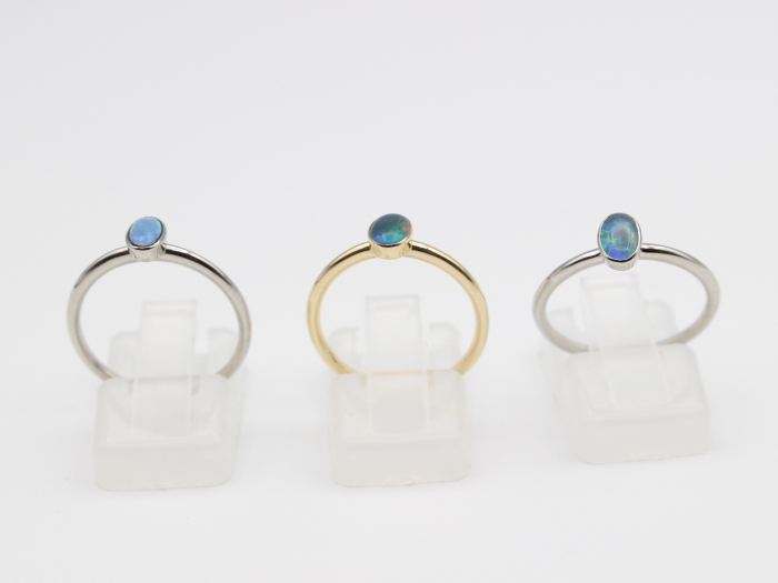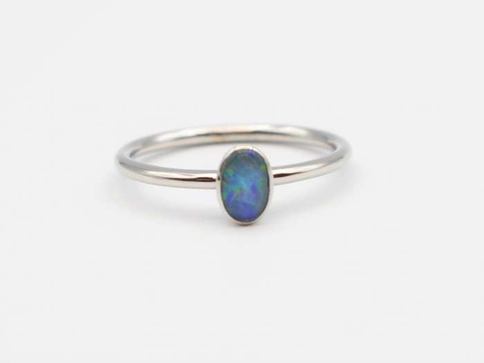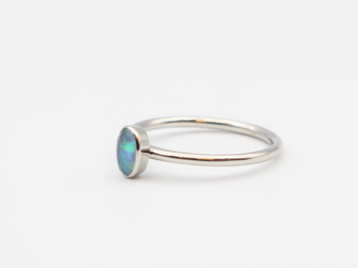 14 karaat witgouden ring gezet met een ovaal cabochon gslepen Opaal. afmeting zetkast 6 x 4 mm. Diameter ring 1.5mm.