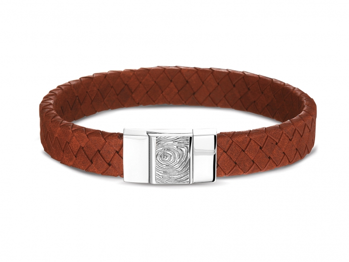 Zilveren armband met lederen bandje. Bovenop het zilveren stuk in het rechthoekige compartiment wordt de vingerafdruk gelaserd. De lederen band is verkrijgbaar in diverse kleuren.
