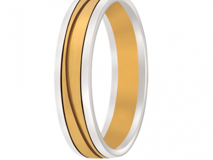 14 karaat geel wit gouden heren trouwring. Breed: 5.5 mm, Hoog: 1.8mm.